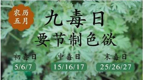 毒五月、九毒日節(jié)制房事的習(xí)俗在很多典籍里都有記載:《農(nóng)歷五月養(yǎng)生》一書提到:五月初五、初六、初七、十五、十六、十七、二十五、二十六、二十七為九毒日,夫妻禁止同房?!饵S帝內(nèi)經(jīng)》中有段采用軒轅黃帝和素女對話方式,談?wù)摿诵陨畹募扇?。素女說:每年農(nóng)歷五月十六日,是天地之氣交合之日,男女不可行房。