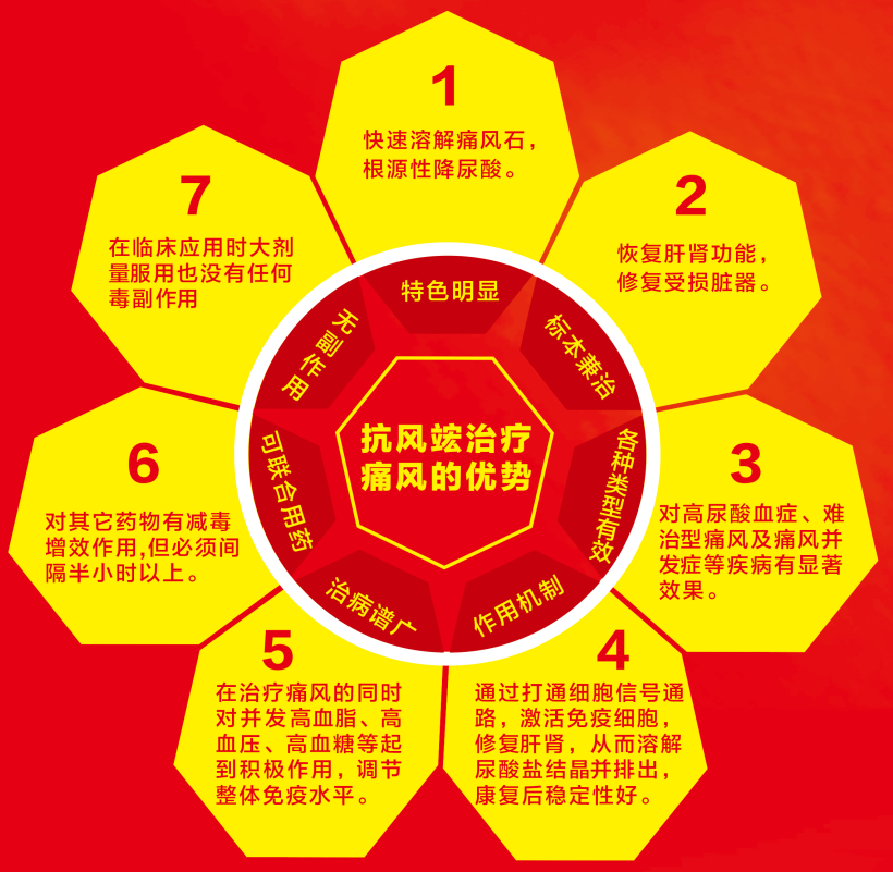 抗風竤之所以受到市場如此多的關注,正是因為抗風竤的產(chǎn)品優(yōu)越于藥物,綠色、安全、尊重自然,彌補了痛風治療領域中,藥物和手術(shù)的不足,不用手術(shù)取石,避免患者受到二次傷害,其中包含以下優(yōu)勢: